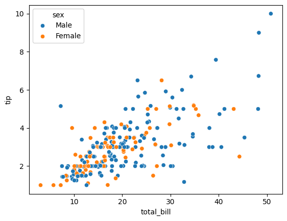 sns.scatterplot(x = 'total_bill', y = 'tip', hue = 'sex', ax = ax, data = tips)