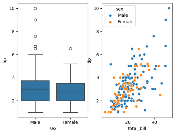 sns.scatterplot(x = 'total_bill', y = 'tip', hue = 'sex', ax = ax[1], data = tips) # 두 번째 차트 생성
