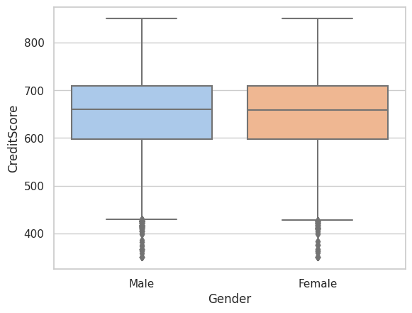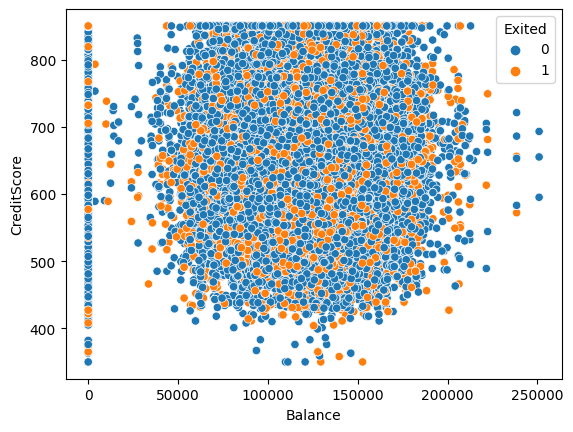 >> 이탈 여부에 따른 Balance와 CreditScore의 선형성은 보이지 않는다.