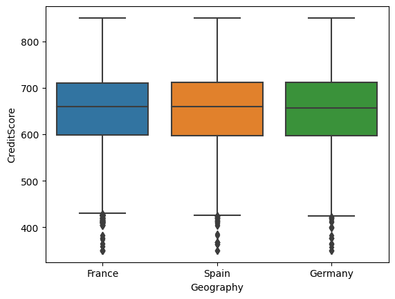 >> CreditScore에 따른 국가별 분포에도 뚜렷한 차이가 보이지 않는다.